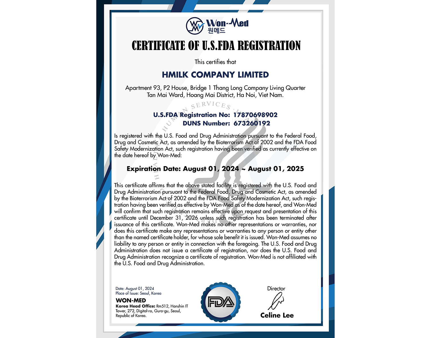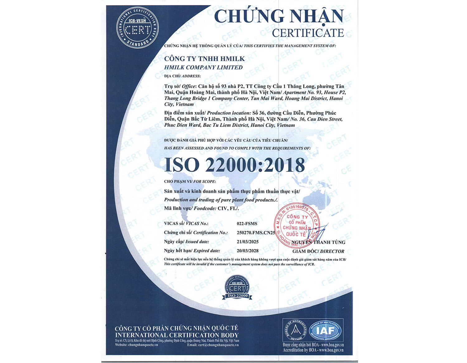 Sản phẩm được cấp giấy chứng nhận ISO 22000 và được Bộ KHCN cấp giấy chứng nhận đo lường tiêu chuẩn chất lượng.