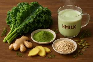 Trong tinh bột gừng có chứa Gingerol là hợp chất có hoạt tính sinh học chính mang dược tính có tác dụng chống viêm và chống oxy hóa mạnh mẽ, kết hợp với cải kale có chứa nhiều vitamin C có vai trò tổng hợp collagen và hàm lượng canxi, vitamin K cao giúp hệ xương chắc khỏe.